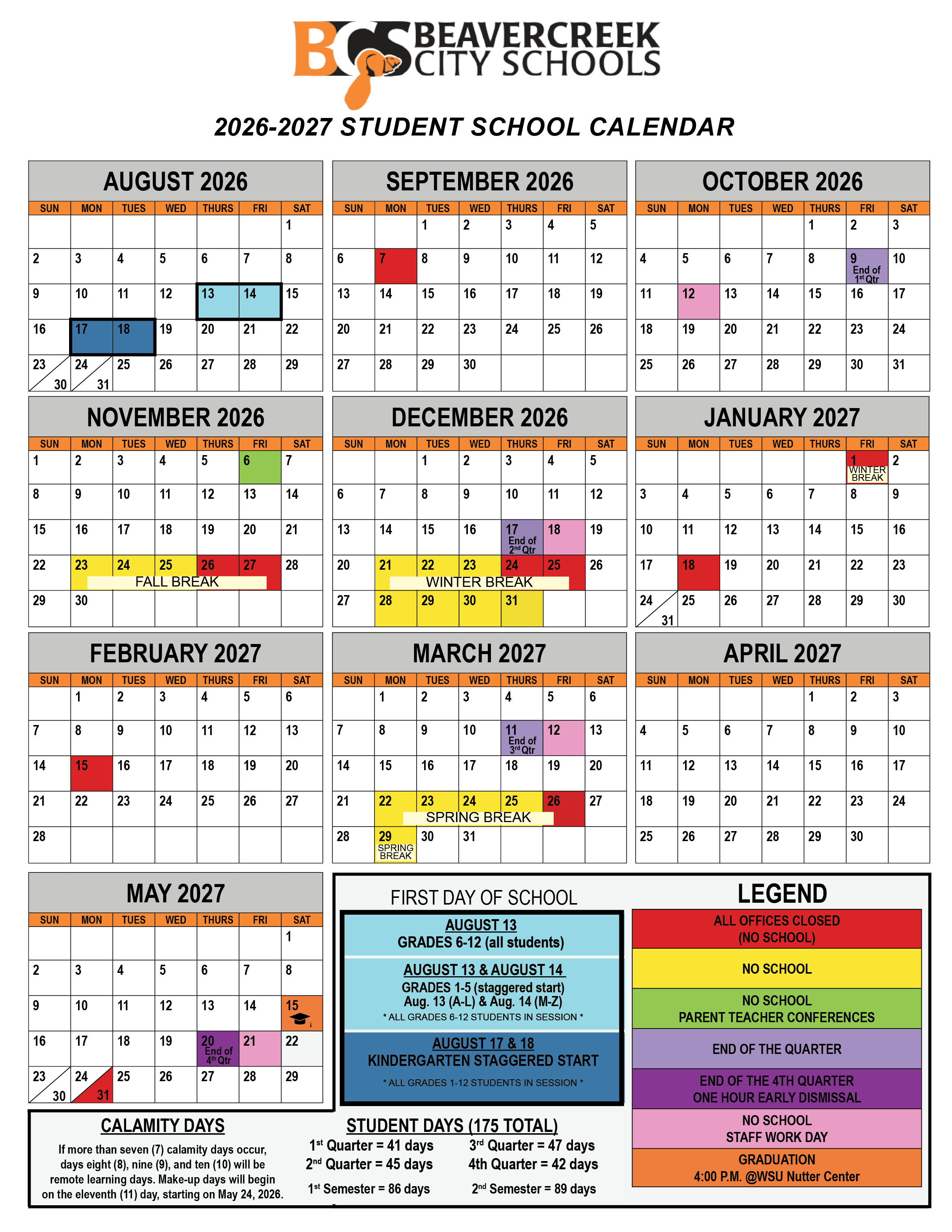2026-2027 Student School Calendar (Approved 3/12/2025)